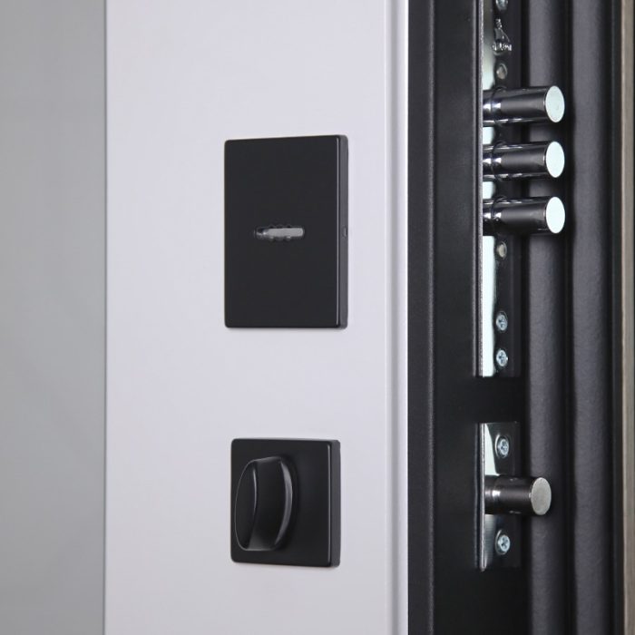 Дополнительно: Евроцилиндр К-В перфокарта. Броненакладка врезная. Штырь противосъемный (3 шт). Порог из нержавеющей стали (цвет «хром»).