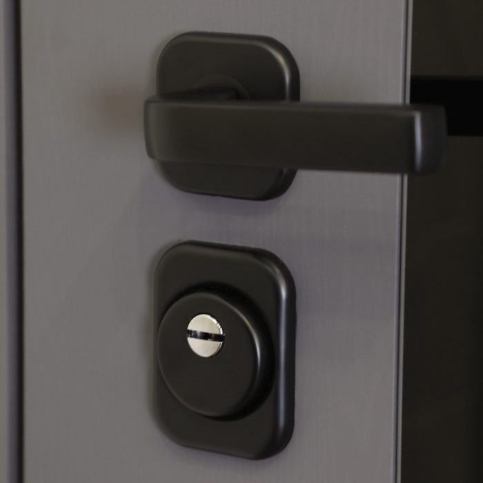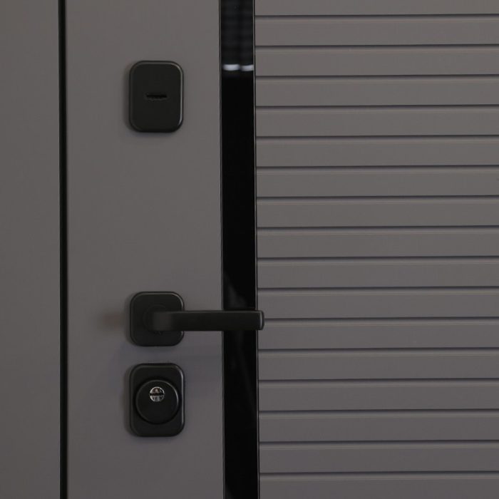 Фурнитура: Ручка, ночная задвижка, глазок на квадратной розетке. Цвет фурнитуры «черный».