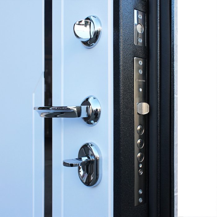 Фурнитура: Ручка, ночная задвижка, глазок на квадратной розетке. Цвет фурнитуры «хром». Смотрите также: ДВЕРНЫЕ ГАДЖЕТЫ