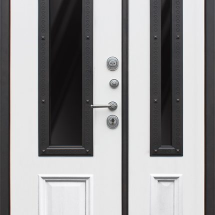 Внутренняя отделка: Панель МДФ 16 мм (цвет «белый матовый»). Объемная фрезеровка. Прижимная рамка 30 мм. (покраска в цвет двери). Стеклопакет тонированный.