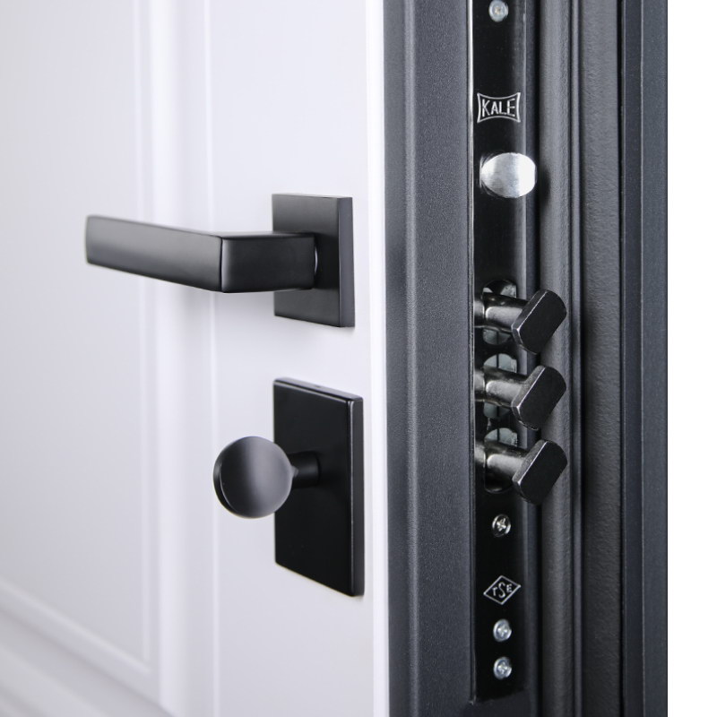 Дополнительно: Лист металла 1 мм под внутренней панелью. Евроцилиндр К-В (перфокарта). Броненакладка врезная. Штырь противосъемный (3 шт.).
