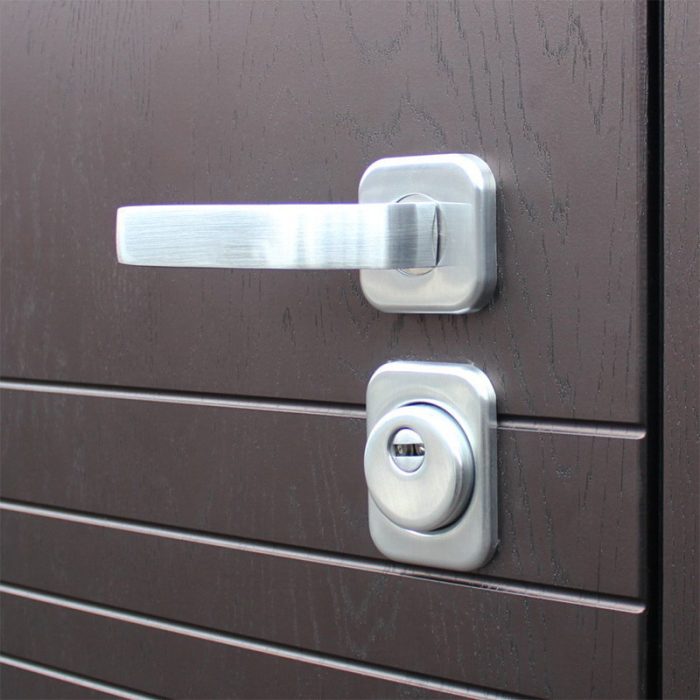 Фурнитура: Ручка, ночная задвижка, глазок на квадратной розетке. Цвет «матовый хром». Смотрите также: ДВЕРНЫЕ ГАДЖЕТЫ