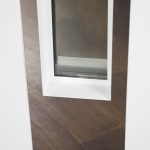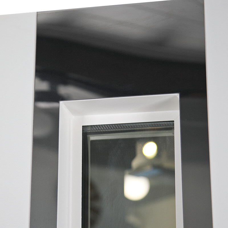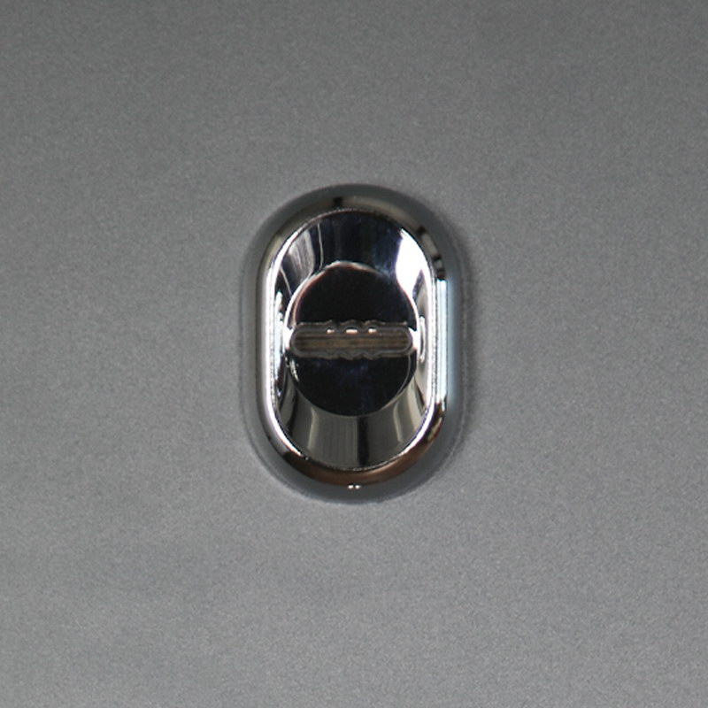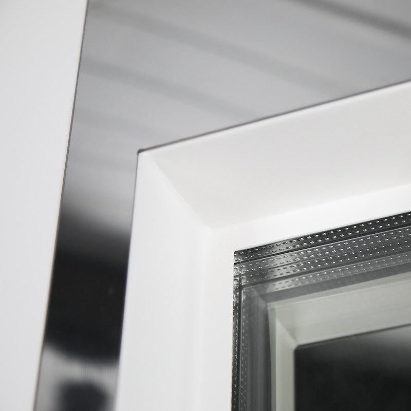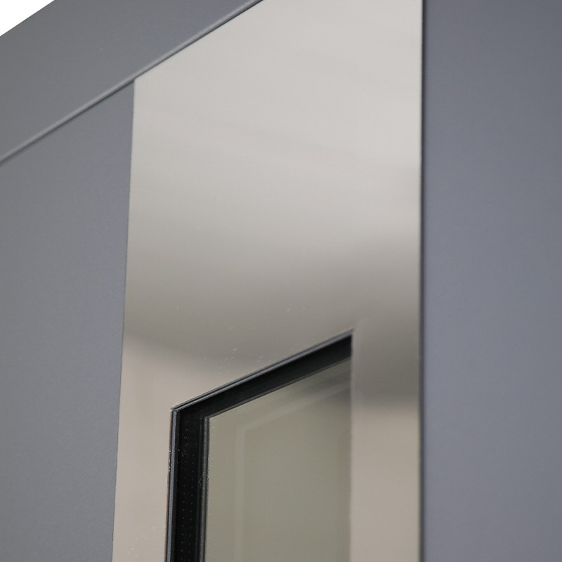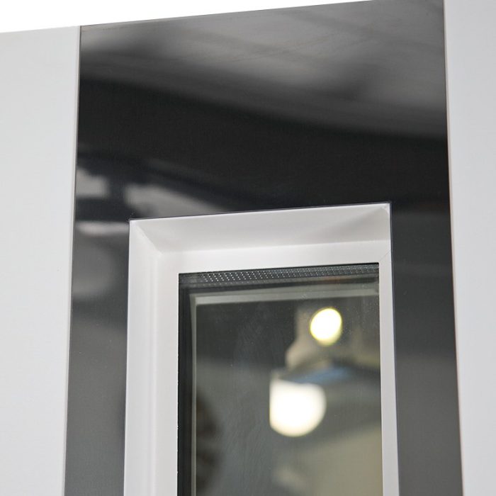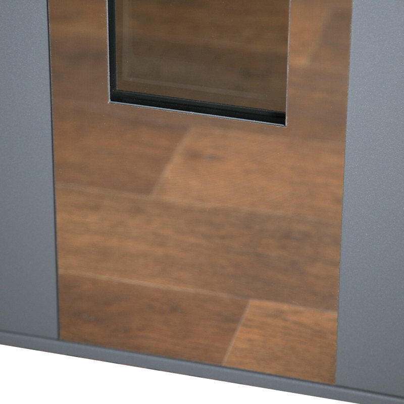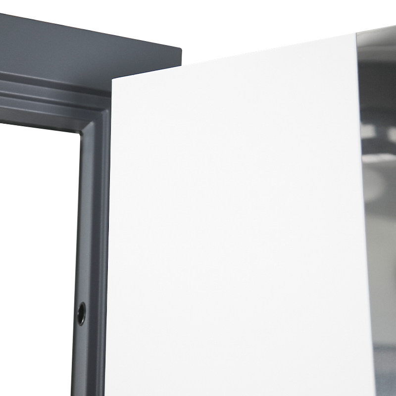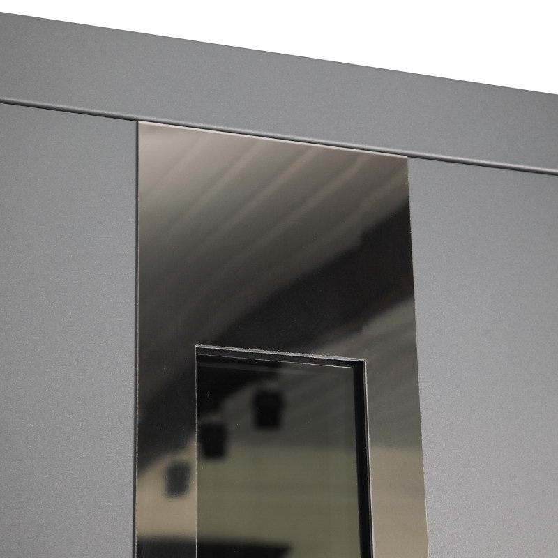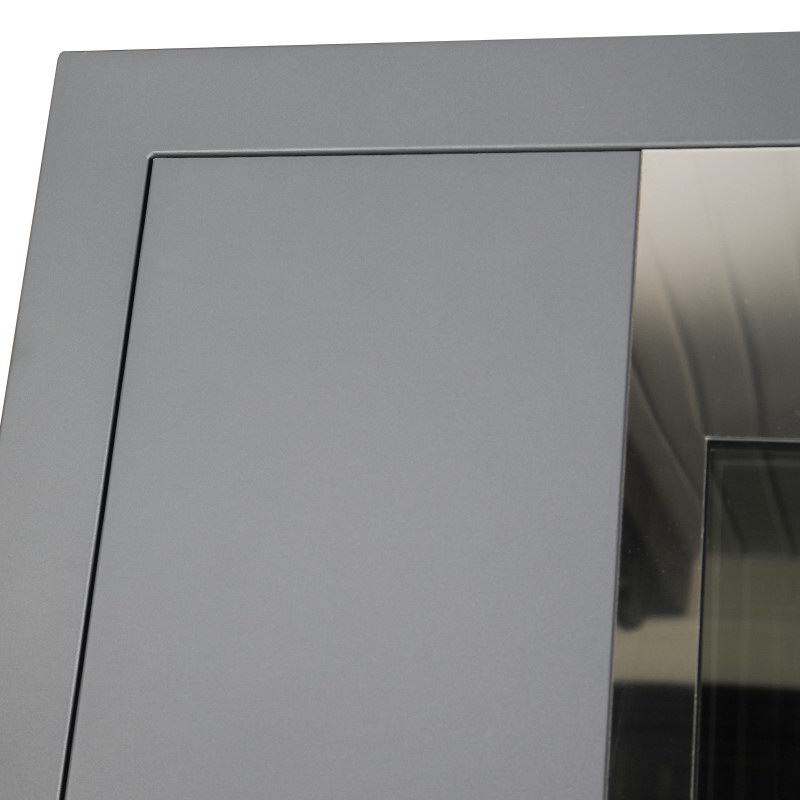 Внутренняя отделка: Порошковое покрытие. Декоративный лист из нержавеющей стали (цвет «хром»). Зеркальный стеклопакет. Прижимная рамка.