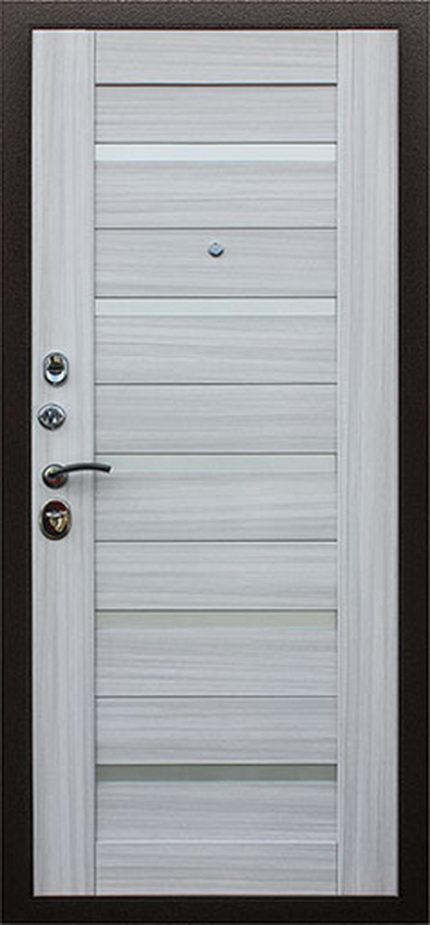 «Маэстро 7Х» (заказная)  - металлическая дверь со стильным дизайном и солидными характеристиками безопасности. Особого внимания заслуживает внутренняя отделка модели, представляющая собой сборную декоративную панель со вставками из матового стекла White Perl. Модель будет отлично сочетаться по стилю с дизайном межкомнатных дверей в квартире.