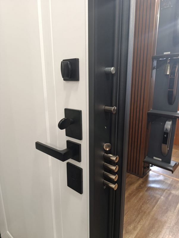 Фурнитура: Ручка, ночная задвижка, глазок на квадратной розетке. Цвет «черный матовый». Смотрите также: ДВЕРНЫЕ ГАДЖЕТЫ