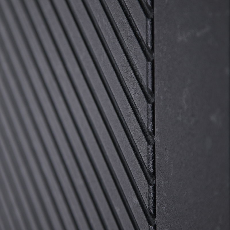 Внутренняя отделка: Экошпонированная панель МДФ 10 мм. Цвет «бетон урбан милк». Объемная фрезеровка. Вертикальная вставка из черного лакобеля.
