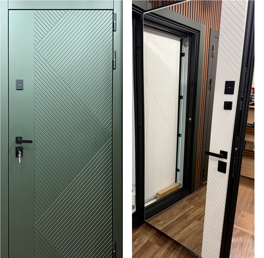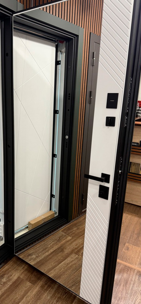 Дополнительно: Евроцилиндр К-В перфокарта. Броненакладка врезная. Штырь противосъемный (3 шт.). Порог из нержавеющей стали (цвет «хром»).