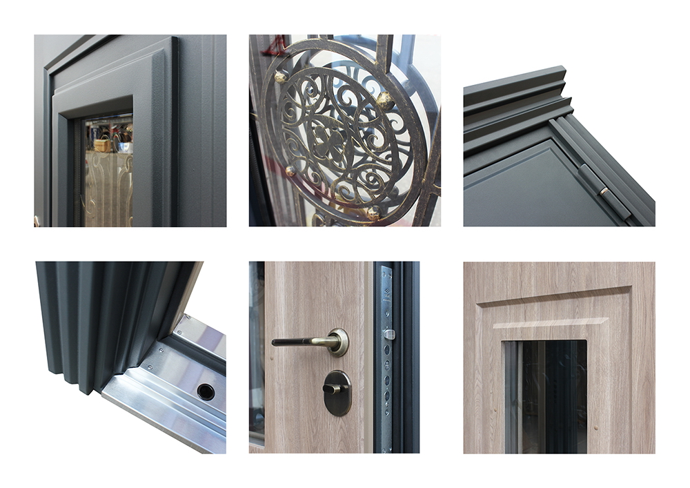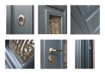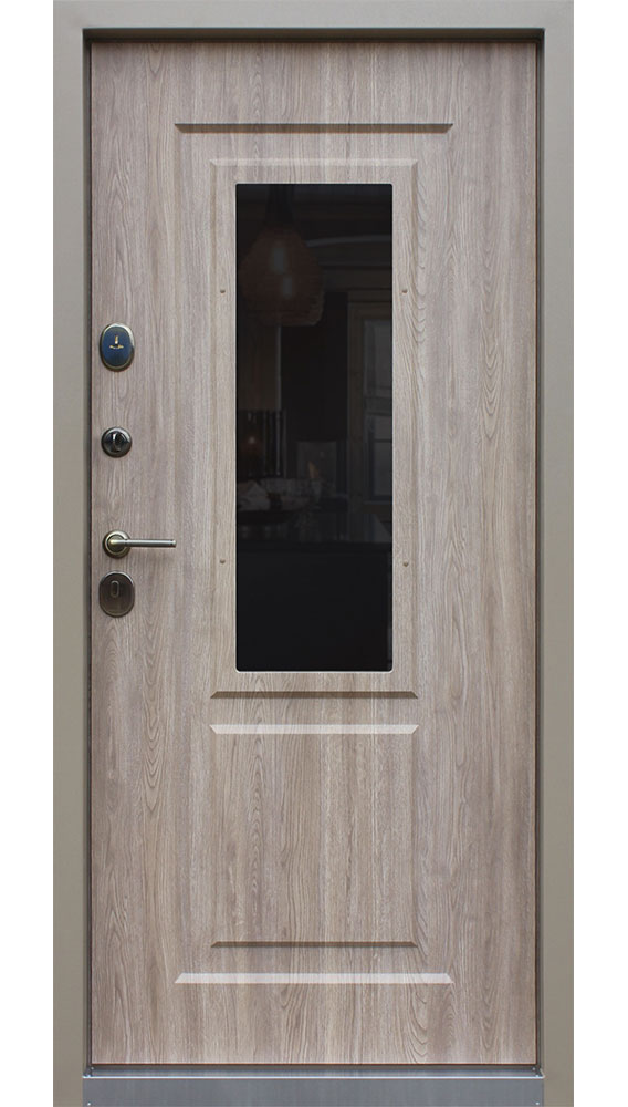 Дополнительно: Евроцилиндр К-В (перфокарта). Броненакладка врезная. Штырь противосъемный (3 шт). Защитные накладки на сувальдном замке. Порог из нержавеющей стали (цвет «хром»). Карниз на дверной коробке.