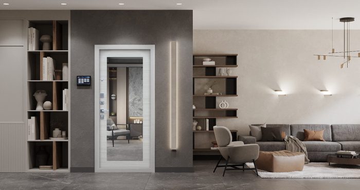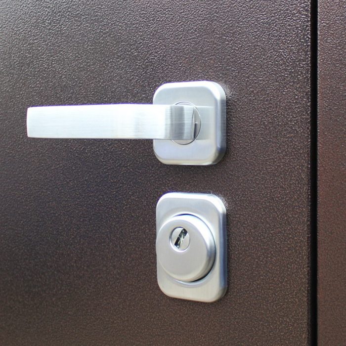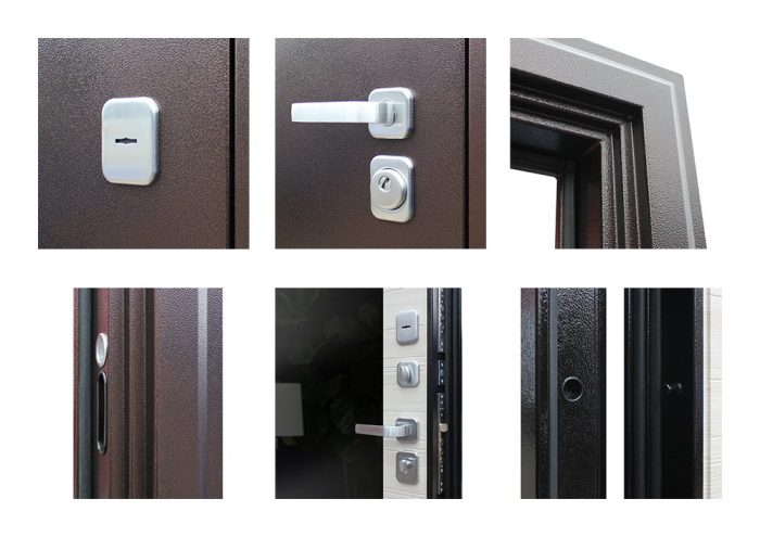 Фурнитура: Ручка, ночная задвижка, глазок на квадратной розетке. Цвет «матовый хром». Смотрите также: ДВЕРНЫЕ ГАДЖЕТЫ