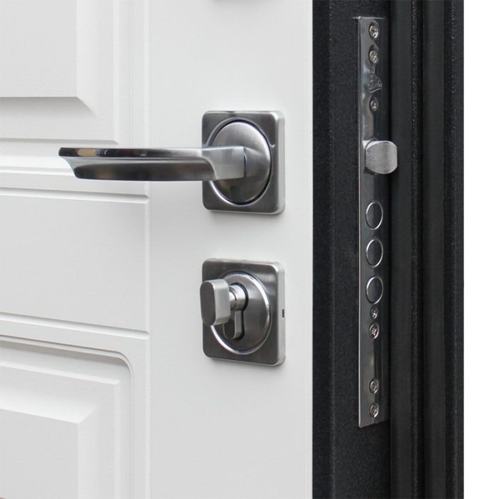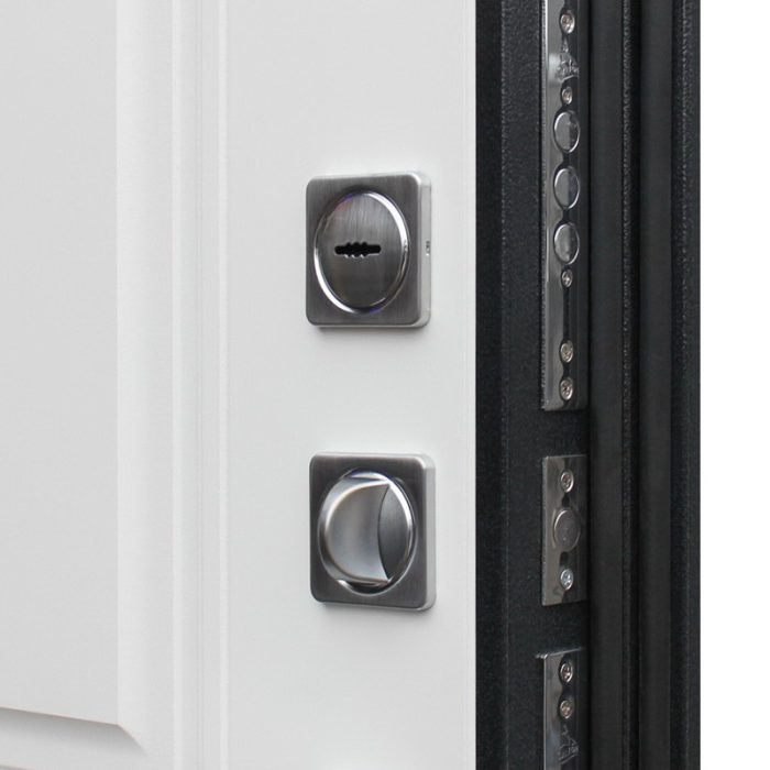 Фурнитура: Ручка, ночная задвижка, глазок на квадратной розетке. Цвет «хром». Смотрите также: ДВЕРНЫЕ ГАДЖЕТЫ