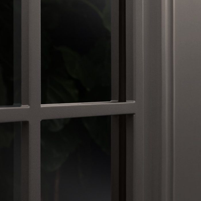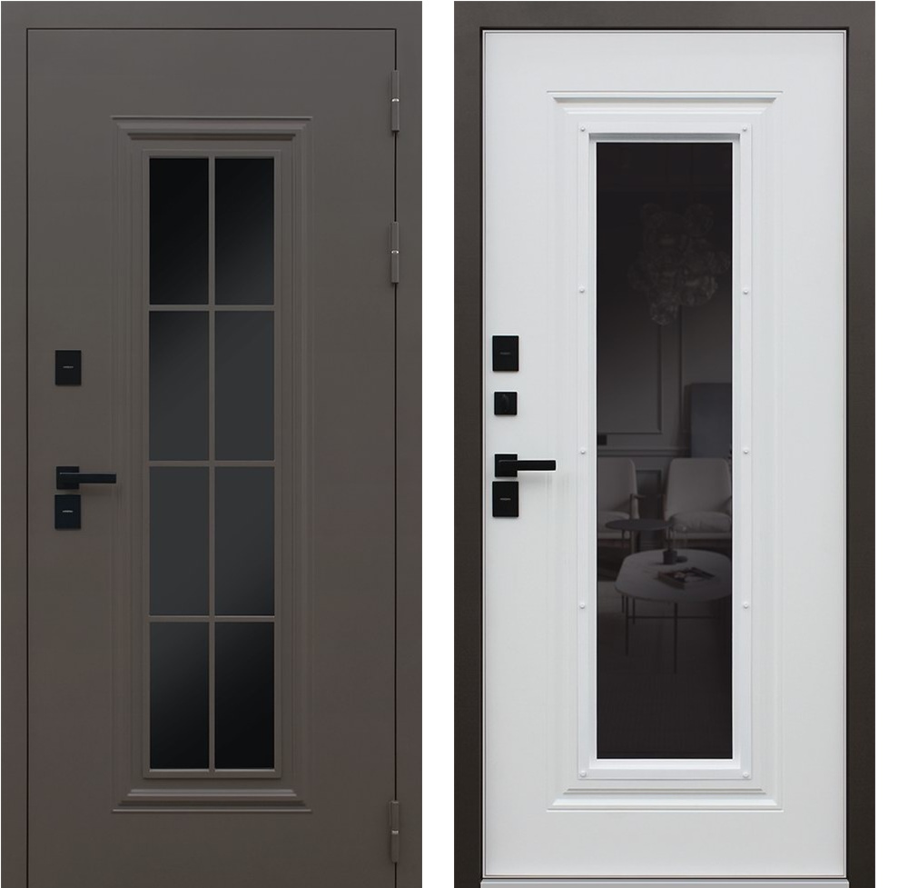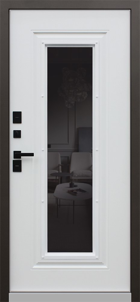 Внутренняя отделка: Панель МДФ 16 мм (цвет «белый матовый»). Стеклопакет тонированный. Прижимная рамка. Объемная фрезеровка вокруг стеклопакета.