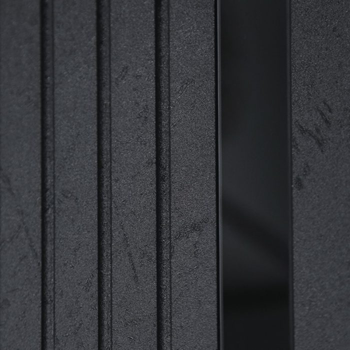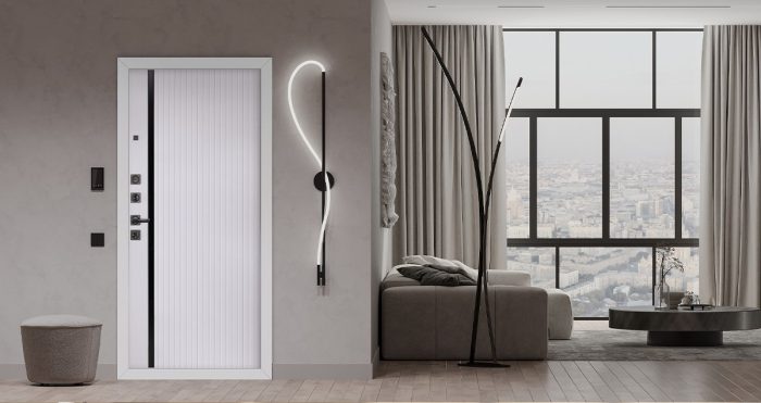 Внутренняя отделка: Экошпонированная панель МДФ 10 мм. Вертикальная вставка из черного глянцевого лакобеля. Цвет «силк сноу».