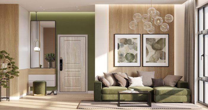 Внутренняя отделка: Экошпонированная панель МДФ 11 мм. Объемная фрезеровка. Цвет «дуб сонома светлый».