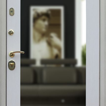 Фурнитура: Ручка, глазок, ночная задвижка на круглой розетке. Цвет «хром». Смотрите также: ДВЕРНЫЕ ГАДЖЕТЫ