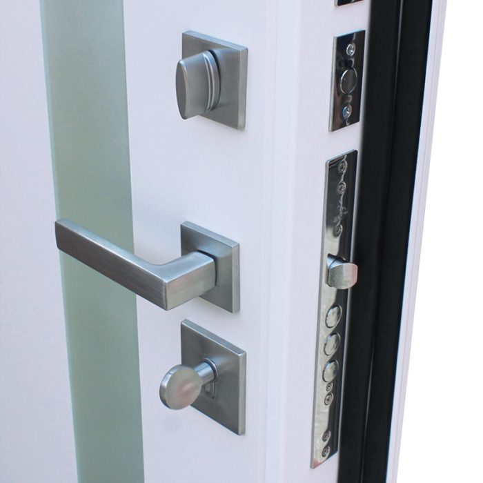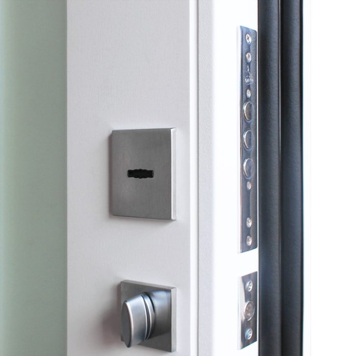 Фурнитура: Ручка, ночная задвижка, глазок на квадратной розетке. Цвет «хром матовый». Смотрите также: ДВЕРНЫЕ ГАДЖЕТЫ