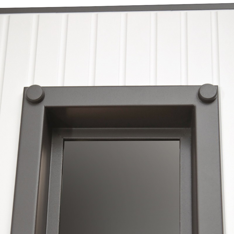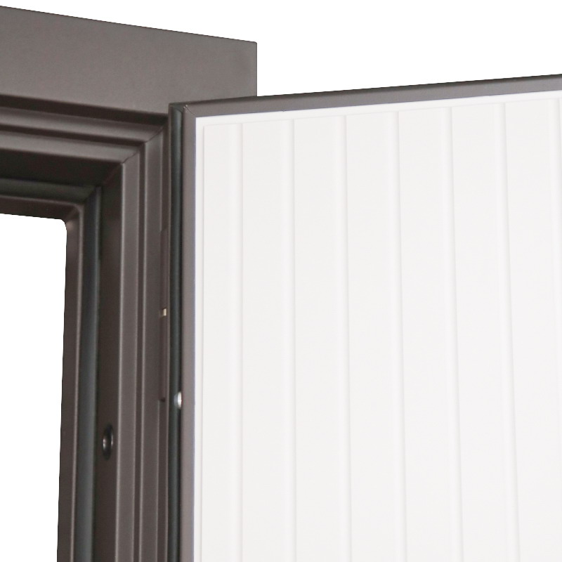 Внутренняя отделка: Панель МДФ 16 мм (цвет «белый матовый»). Объемная фрезеровка. Прижимная рамка 30 мм. (покраска в цвет двери). Стеклопакет тонированный.