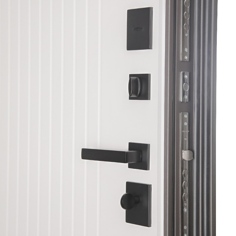 Дополнительно: Евроцилиндр К-В перфокарта. Броненакладка врезная. Штырь противосъемный (3 шт). Порог из нержавеющей стали (цвет «хром»).