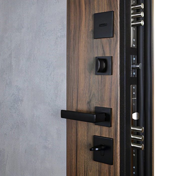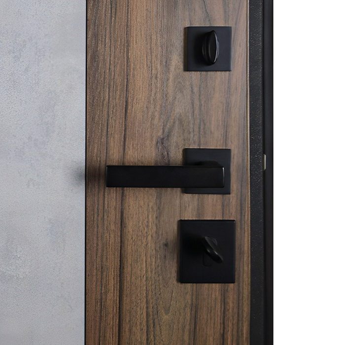 Фурнитура: Ручка, ночная задвижка, глазок на квадратной розетке. Цвет фурнитуры «черный». Смотрите также: ДВЕРНЫЕ ГАДЖЕТЫ