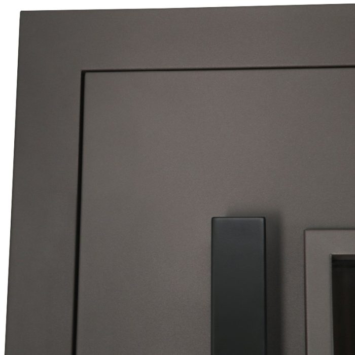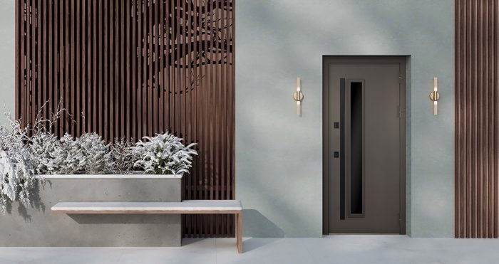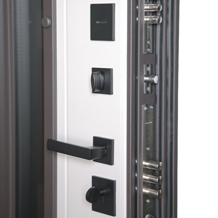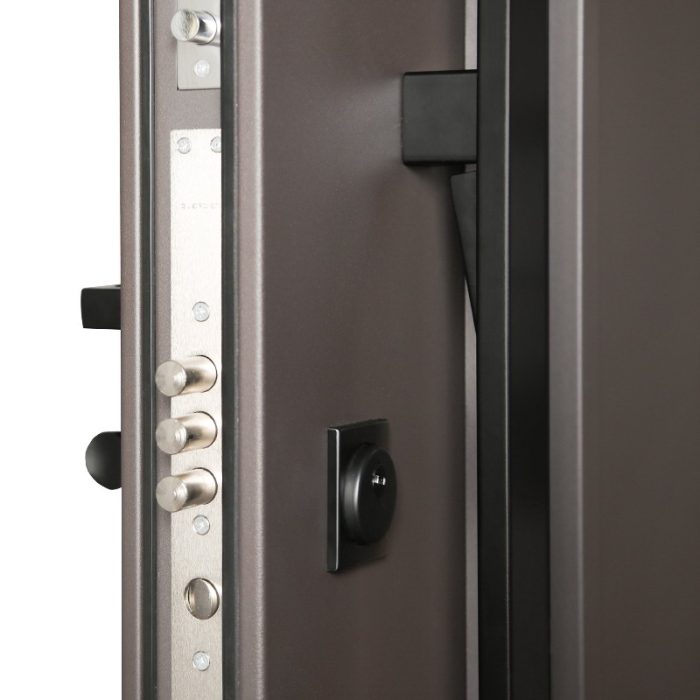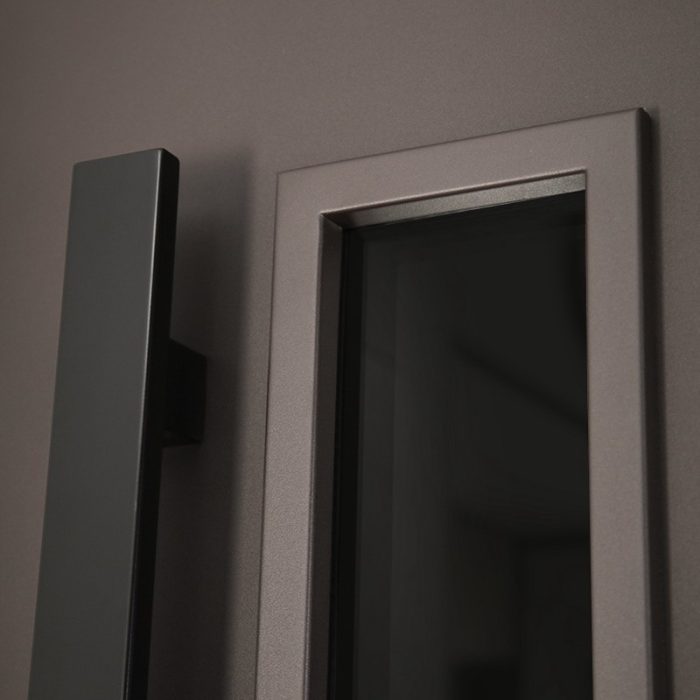 Фурнитура: Снаружи ручка–скоба Art 1640 х 60мм х 20мм Inox Basic Mechanical (цвет ral 9005). Внутри ручка RedLine, ночная задвижка на квадратной розетке (цвет «черный»). Смотрите также: ДВЕРНЫЕ ГАДЖЕТЫ