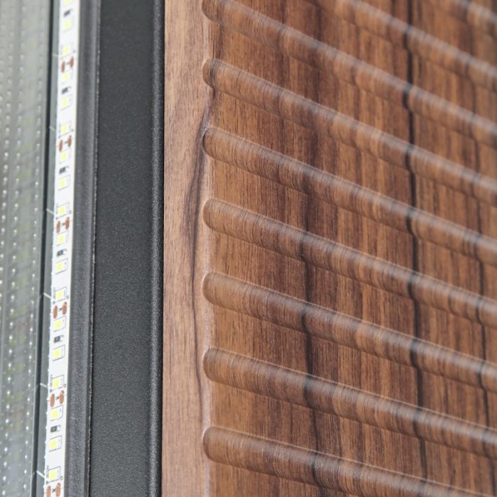 Внутренняя отделка: Влагостойкая панель МДФ 16 мм. Дизайн панели выполнен в виде комбинации: «орех каньон коньяк 666-2», «черный кварц». Прижимная рамка скрытая.