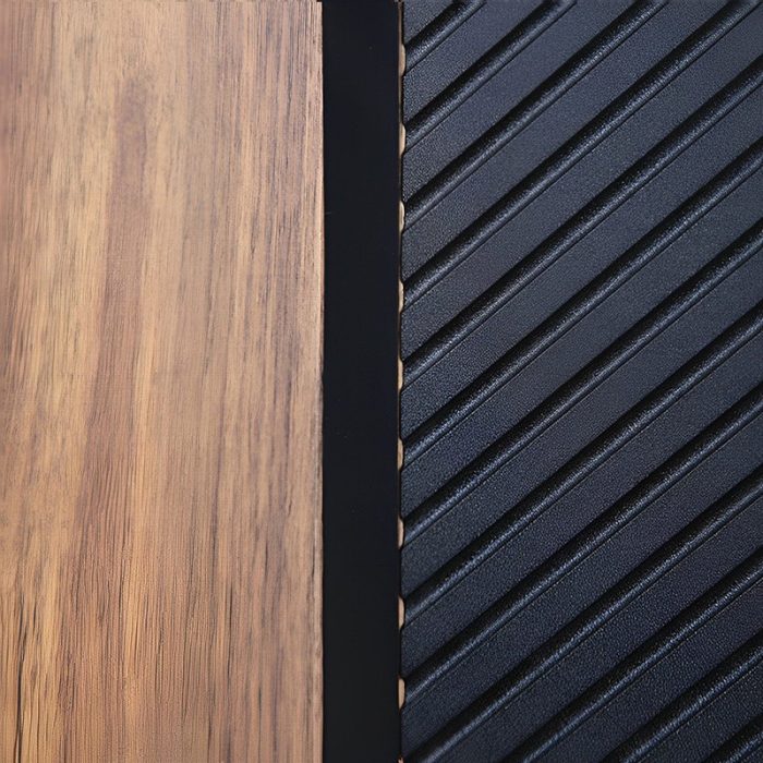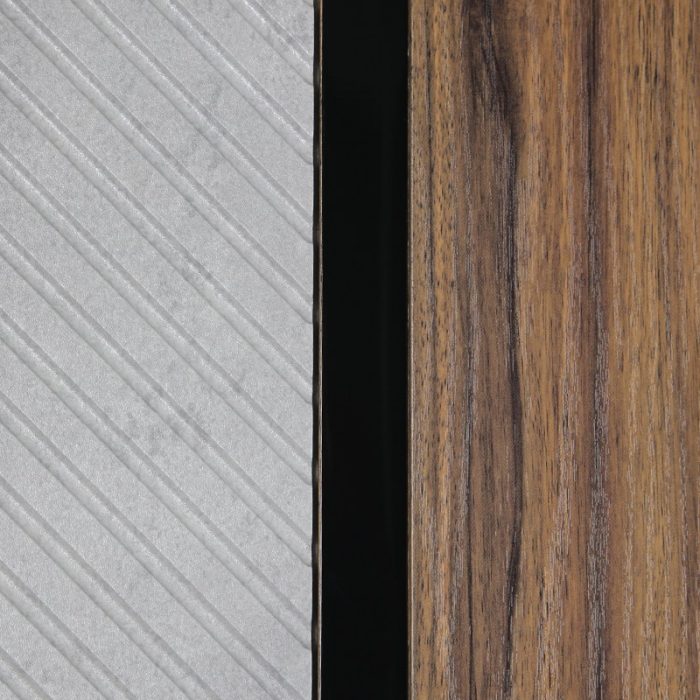 Внутренняя отделка: Экошпонированная панель МДФ 10мм. Цветовая комбинация: «бетон светлый» и «орех коньяк». Декоративная пластиковая вставка в черном цвете.