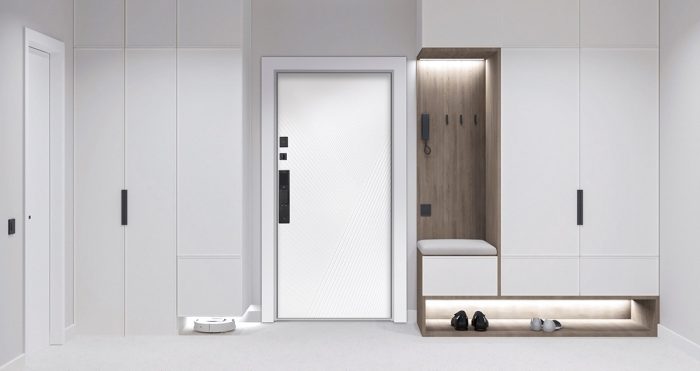 Внутренняя отделка: Экошпонированная панель МДФ 10 мм. Цвет «белый матовй».Линейная фрезеровка в современном стиле