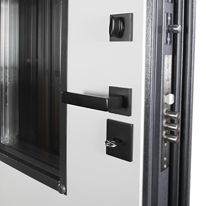 Фурнитура: Ручка, ночная задвижка, глазок на квадратнй розетке. Цвет фурнитуры «черный».Смотрите также: ДВЕРНЫЕ ГАДЖЕТЫ