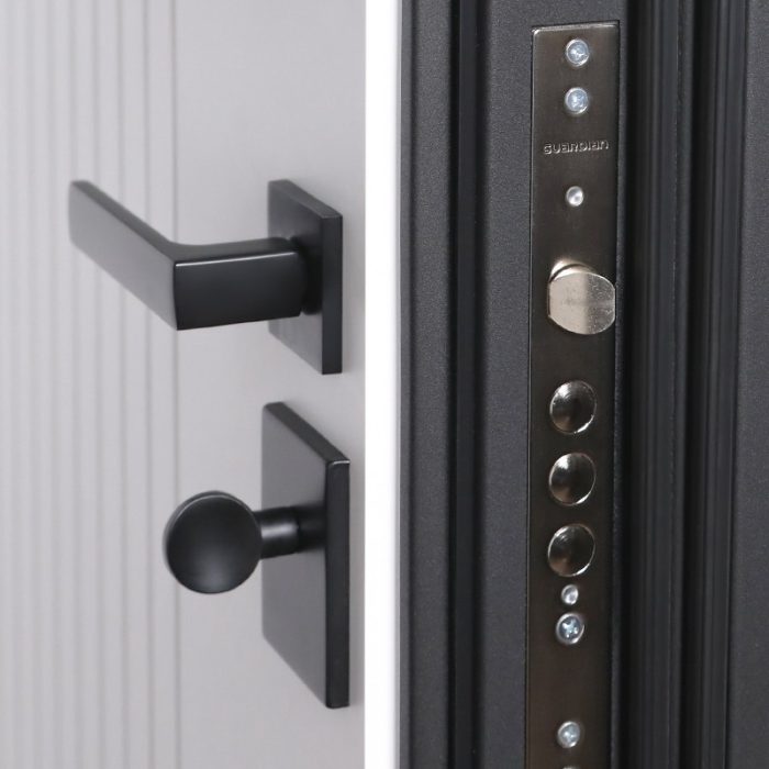 Фурнитура: Ручка, ночная задвижка на квадратной розетке (цвет «черный»). Смотрите также: ДВЕРНЫЕ ГАДЖЕТЫ