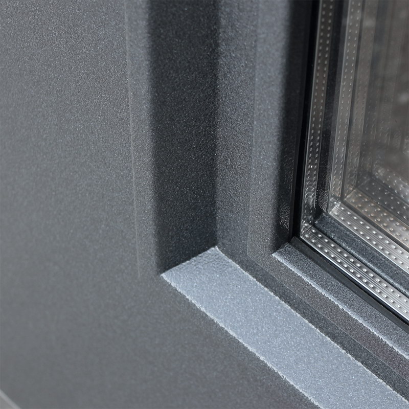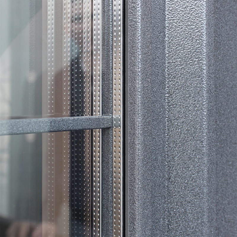 Покрытие: Два цвета покраски рамы и полотна: внешняя сторона — «букле графит», внутренняя сторона — «муар белый». Два слоя покрытия: первый слой — цинкогрунт, второй слой — порошковое покрытие
